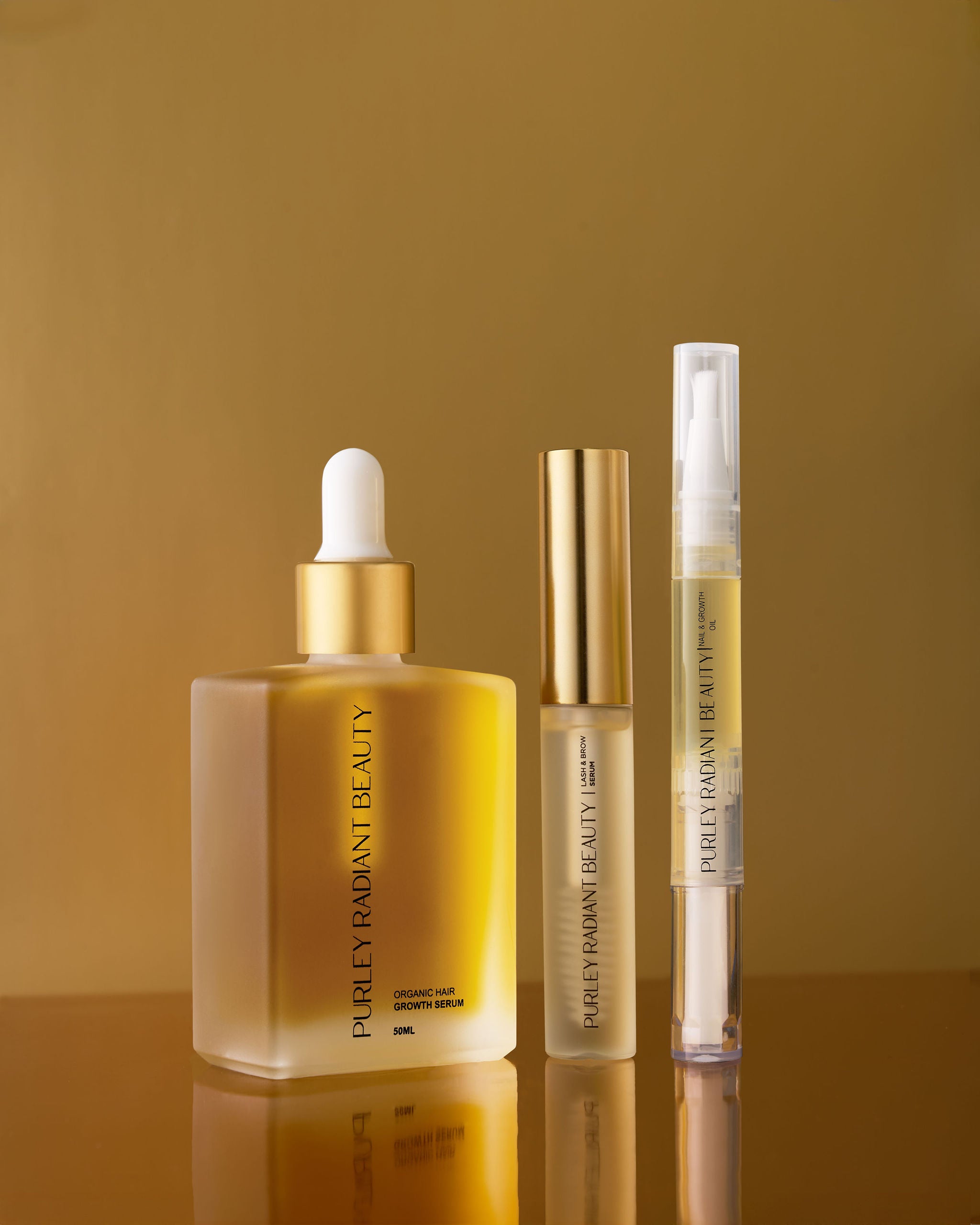 Elevate your beauty routine with the Purely Radiant Beauty Glow Up Bundle. A powerful 3-piece system designed to support visibly longer lashes, fuller brows, stronger nails, and healthier-looking hair.